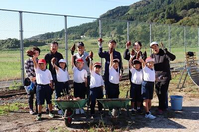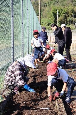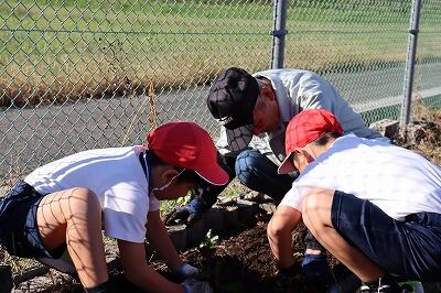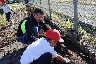 地元老人クラブの岡崎様、羽場様、三上様のご協力をいただいて1・2年生がいも掘りをしました。